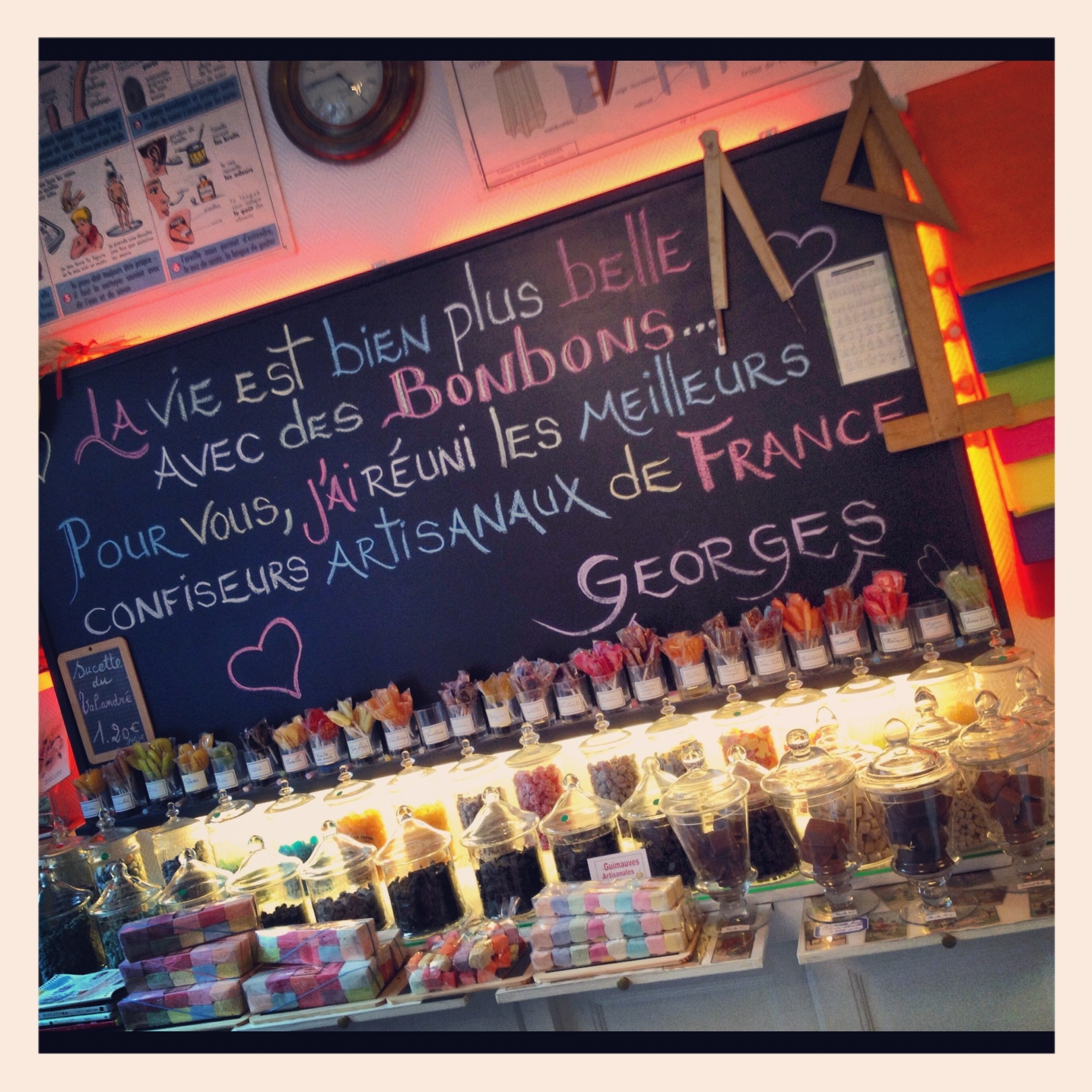 J’ai donc poussé la porte de cette magnifique boutique située « 19 rue Monge »à Paris, décorée à souhait dans un style « la classe du petit Nicolas ». On y retrouve les anciens bureaux d’école, le tableau noir, le compas et l’équerre en bois, l’horloge qui indique l’heure de la récré…etc etc Tout y ai bien coordonné et surtout par dizaines de jolies bonbonnières remplies de bonbons… et pas n’importe lesquelles finalement!!!