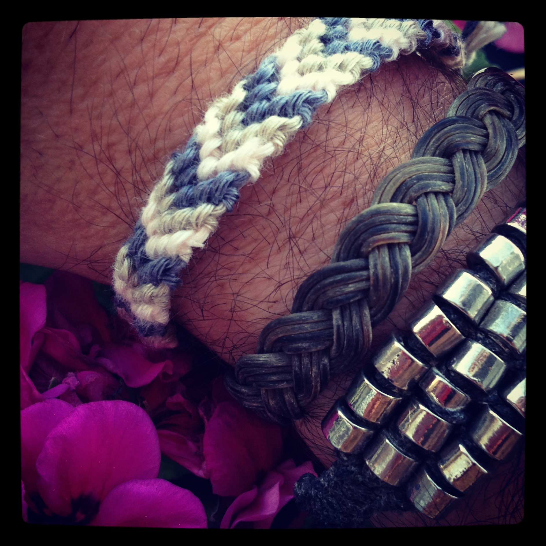 La mode, la mode, la mode encore la mode……etc Alors oui shopper les trucs tendances c’est mon dada, mais mettre un prix extravagant pour avoir des bracelets brésiliens jusqu’au coude, là ça devient ridicule!!!!! J’ai donc opté pour avoir bien sûre mon « Hipanema » mais aussi un « Kim & Zozi », puis pour le reste je vais faire la petite fourmis et travailler, travailler….J’ai donc couru acheter du fil DMC, et après deux mois de boulot j’ai tissé une bonne vingtaine de bracelets, que j’ai confectionné pour moi, mes filles et mes nerveux, mais aussi mon homme!!!! Puis j’ai même fait des bracelets pour les chevilles ainsi que des « HeadBand »…