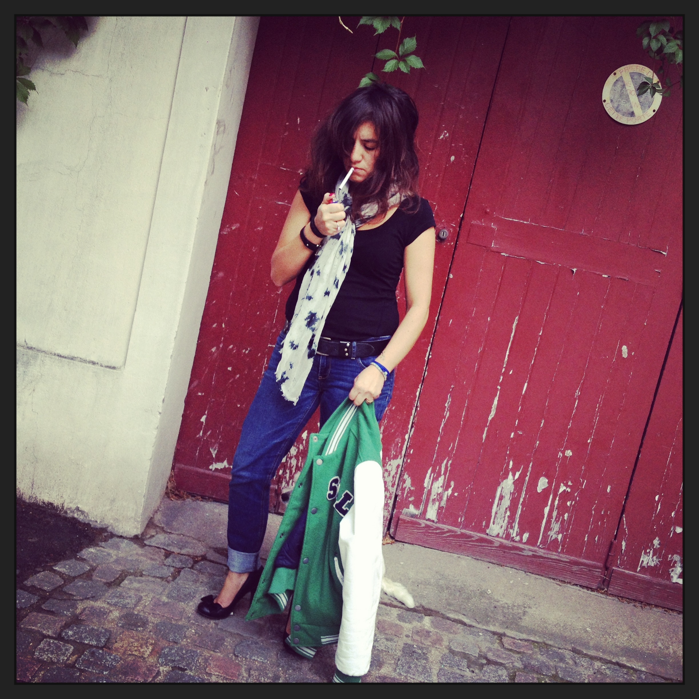 Bref…… et je sors mes motards »Carolina » d’époque s’il vous plait!!!! Ca c’est du « Vintage », puis je vais me nicher devant mon ancienne école…. Et hop un petit « instagram ». Look que j’ai assortit avec un slim bien trendy Abercrombrie&Fitch, quant à lui, et un top noir basic, Comptoir des cotonniers!!!!! Sinon on peut aussi faire la version « rebelle »…. Et oui je me sens « ado » maintenant!!!! et après les cours c’est direction le café « d’en face » et là on lâche les cheveux , on enfile des talons, on peut aussi enfiler un « boy friend » et clope au bec!!!! ( ça c’est un truc très rebel car je fume plus depuis 15 ans!!!) D’ailleurs moi j’irai pas au café « d’en face » mais plutôt au « dada » question d’âge!!!