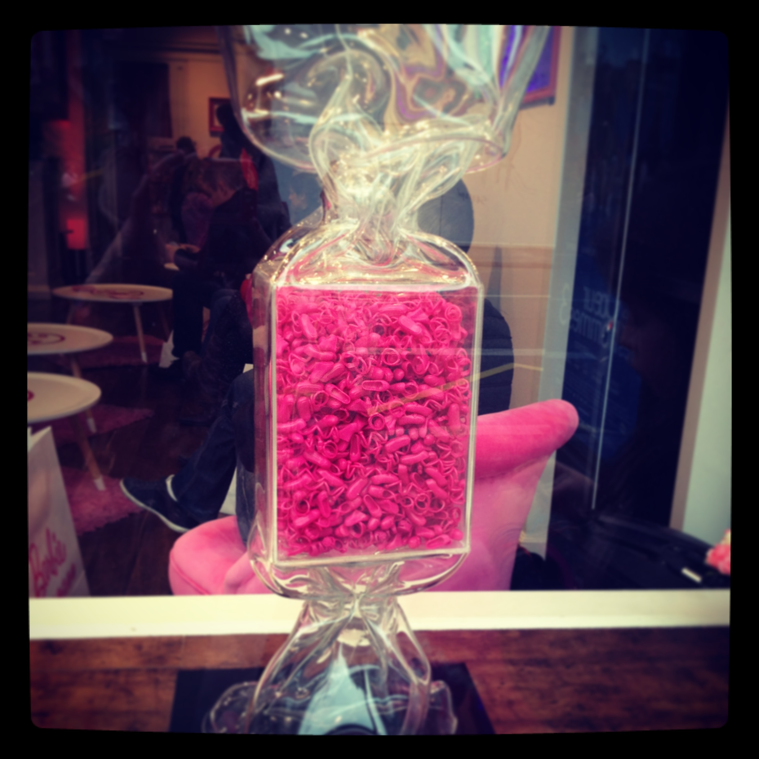 Alors si comme moi vous avez des « nenettes » allez dans ce magasin éphémère qui propose des ateliers, des photos et du cinéma autour de notre chère Barbie, celle qui nous a fait rêver étant petite et celle qui fait rêver nos petites filles aujourd’hui. On y trouve donc une salle de cinéma où sont projetés des films Barbie et un bar où les parents peuvent attendre tranquillement leur fille….La déco est très strass, penpilles, boules à facettes etc etc mais aussi des Barbies de collection et des vitrines sympa très « glossy » rose bonbon et pour les « Bonbons » une réalisation en association avec l’artiste « Laurence Jenkell ».